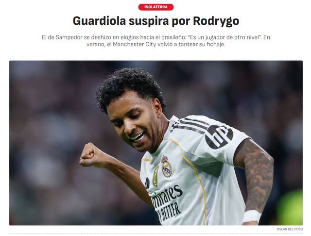 去年夏天,瓜迪奧拉的曼城就希望引進羅德里戈,但巴西前鋒決定留在皇馬,為主力位置而戰。《阿斯報》指出,瓜迪奧拉對羅德里戈的欣賞未曾改變,就像這場歐冠賽后,瓜帥第一時間找羅德里戈交流。能得到瓜迪奧拉的長期認可和推崇,這是對羅德里戈實力的認證。